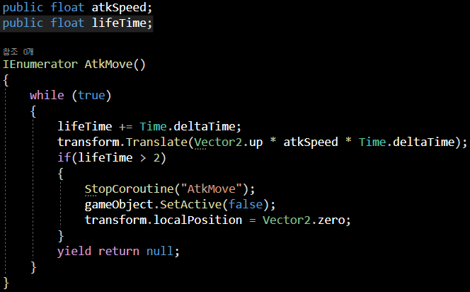 Atk(공격 물체) 가 활성화 되면 코루틴 함수 AtkMove가 실행되게 하였습니다.