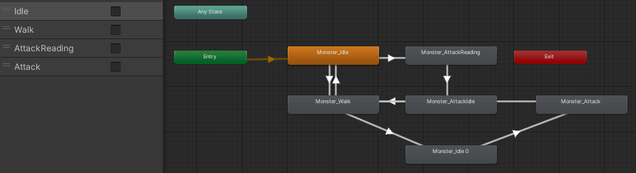 public enum MonsterState { Idle, Walk, AttackReading, AttackIdle, Tracking, Attack } public MonsterState monsterState = MonsterState.Walk몬스터의 상태는 대기, 걷기, 공격 준비중, 공격 대기, 추적, 공격 으로 총 6가지가 있습니다.