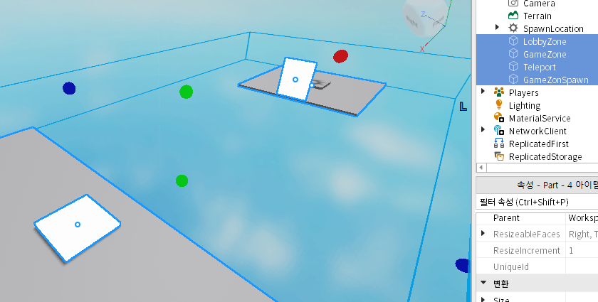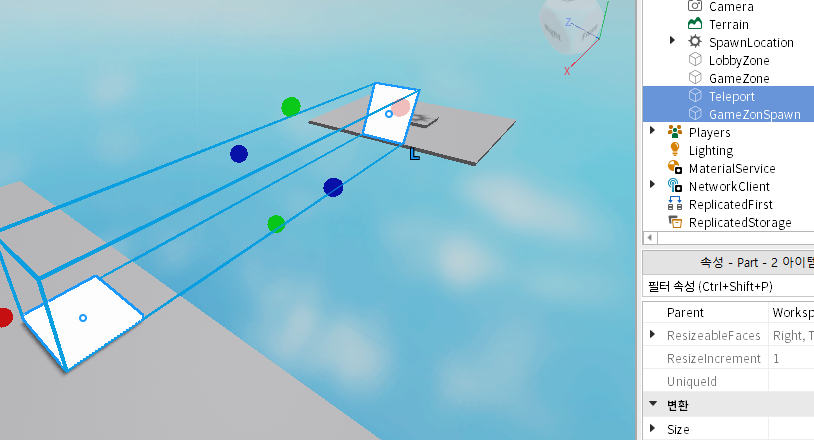 다음은 GameZone으로 이동할 텔레포트 Part와 스폰 위치가 될 GameZonSpawn 을 만들었습니다.