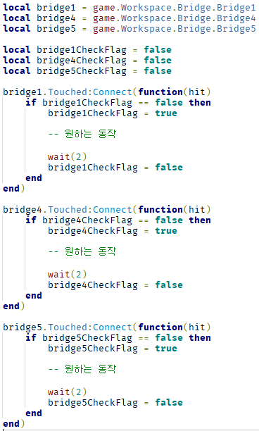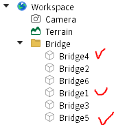 또한 위에서부터 보자면 Workspace 공강 내에 Bridge 폴더에 Bridge1~3의 Part에 접근하는 모습입니다.