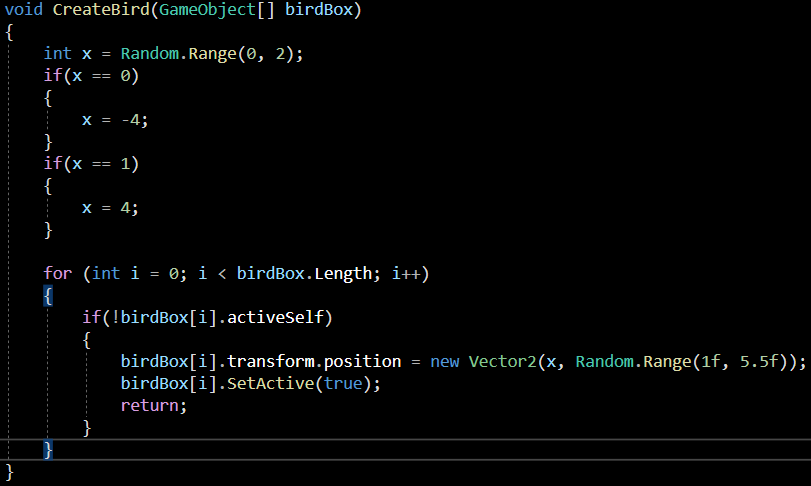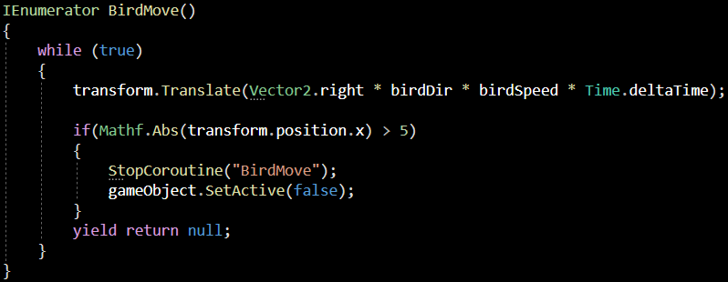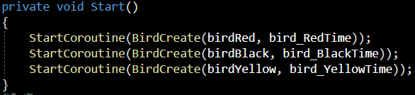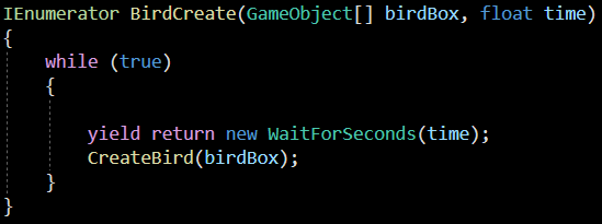 코 루틴 함수로 이어서 만들어도 되지만, 코드 내용이 길어져 복잡해 지기에 CreateBird라는 함수를 새로 만들었습니다.