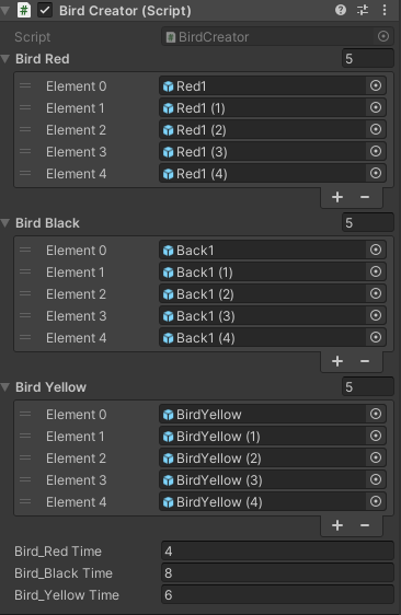 GameObject - Bird Creator 컴포넌트 x축 : -4 혹은 4의 값을 받은 위치와 y값 은 1f - 5.5f의 값으로 생성되어