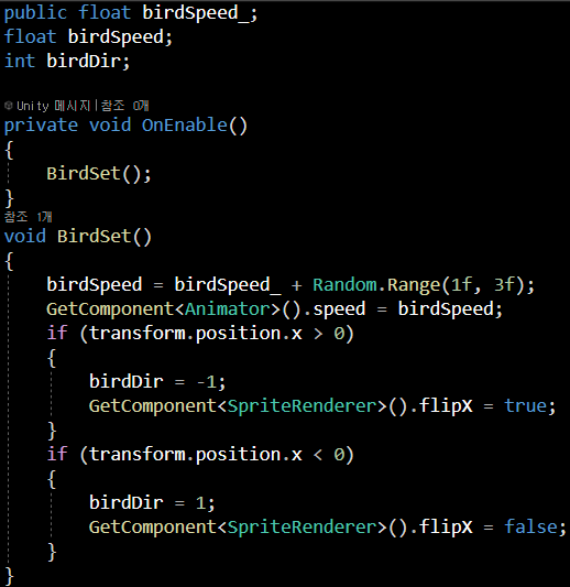 BirdSet함수를 보면 birdSpeed는 지정한 birdSpeed_ 와 + 랜덤 1f - 3f의 값을 받아온 뒤