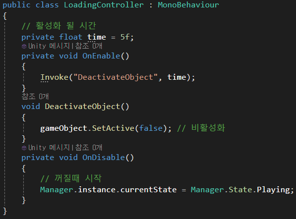 time 변수를 선언하여서 오브젝트가 활성화될 때 실행될