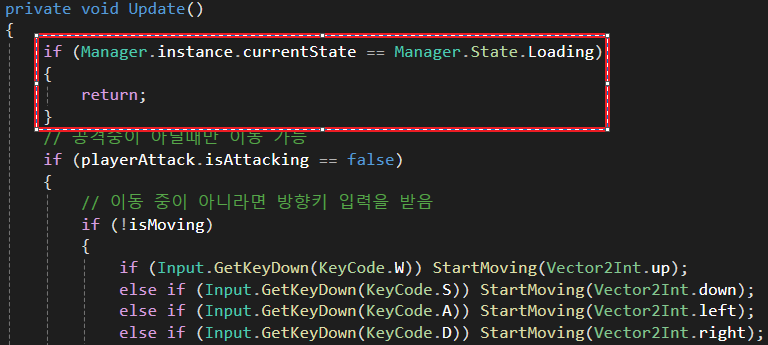 로딩 중일 땐, 플레이어가 움직임이나 공격 등 어떠한 상호작용도 이루어지면 안 되게 하는 것이었습니다.