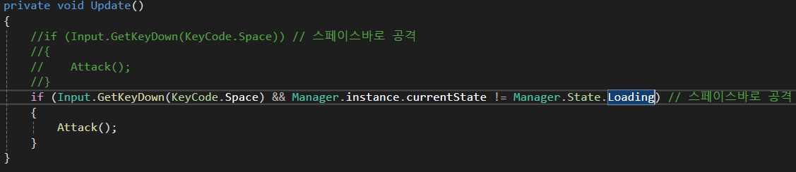 기존 Space 키를 누르면 시작될 공격에 조건문을 추가해 주었습니다.
