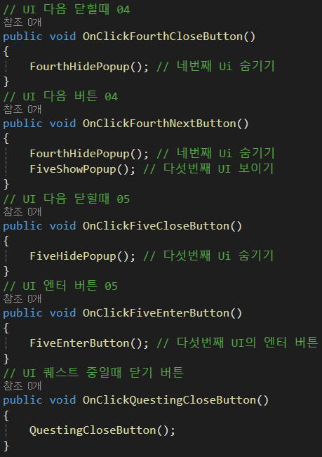 각 Public으로 선언하여 버튼의 OnClick 이벤트로 연결을 해 주었습니다.