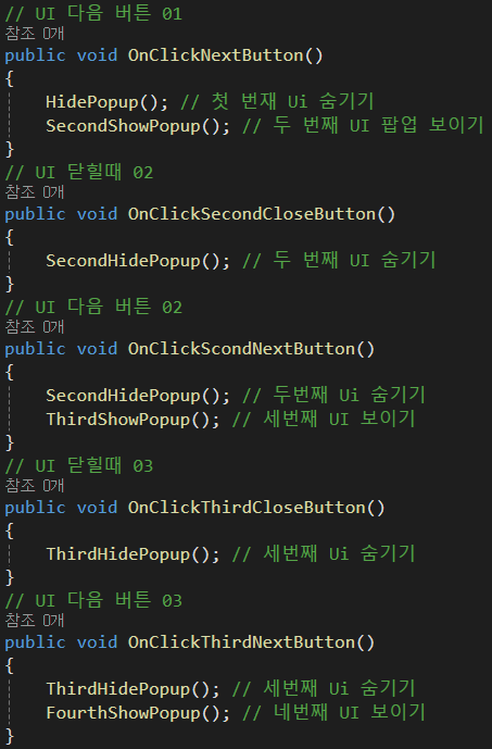 (Text, nextButton, CloseButton) 각 기능에 맞게 OnClickEvent로 연결을 시켜 주었습니다.
