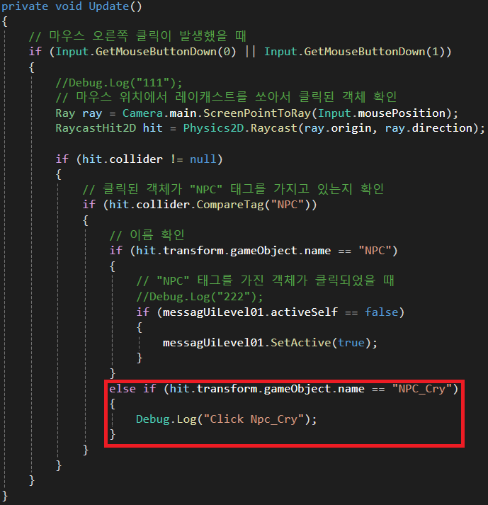 NPC_Helper를 클릭했을 때와 달리 NPC_Cry를 클릭하면