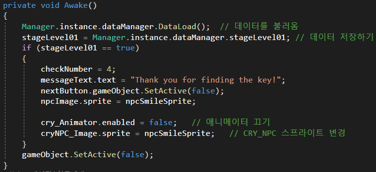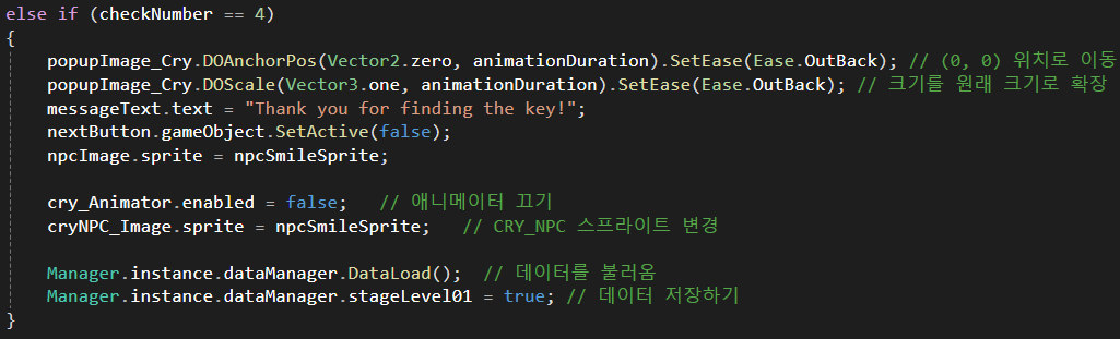 1. key 오브젝트와 상호작용 후 CheckNumber가 4로 변경되어 NPC를 클릭하면 실행