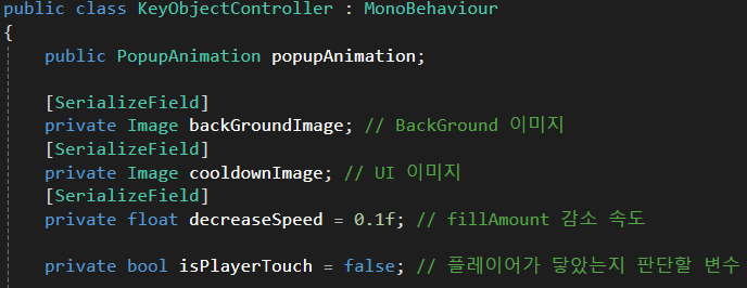 다음은 KeyObjectController 스크립트의 선언 변수입니다.