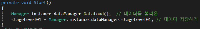가장 먼저 Start 함수를 보자면 stageLevel01의 값을 받아와 주었는데