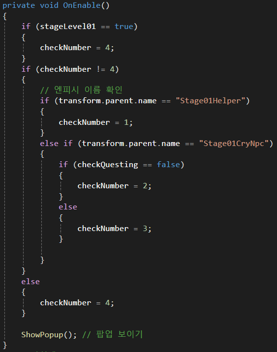 다음은 UI가 팝업 될 때 실행될 OnEnable() 함수에서