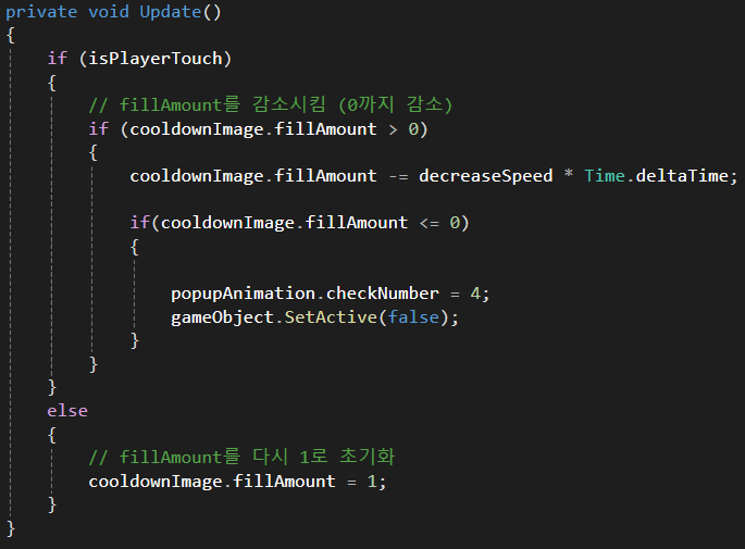 * fillAmount의 초기값의 1에서 0으로 0.1씩 감소시켜주고 있습니다.