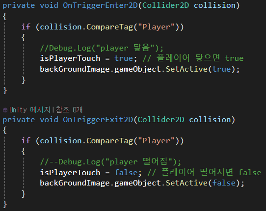 가장 먼저 OnTrigger로 Enter(터치하였을 때)와 Exit(떨어졌을 때)