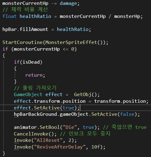 hpBarBackGround.gameObject.SetActive(false);(몬스터는 죽었으니 게이지바는 비활성화해줍니다.)