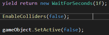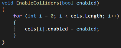 EnableColliders() 함수는 각 콜라이더를 파라미터 enabled에 맞게 true / fasle 해주는 함수 구현입니다.