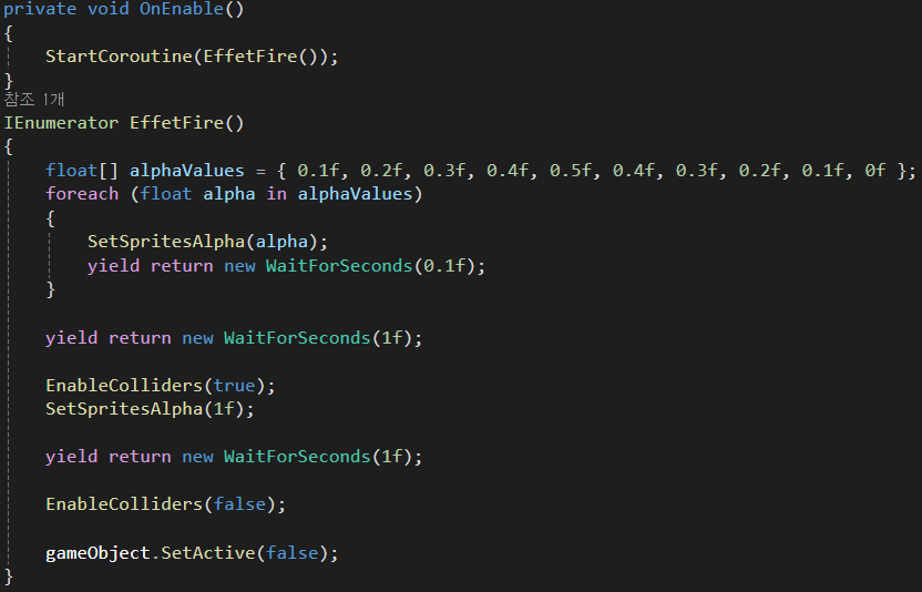 OnEnable() 함수를 통해 StartCorutine으로 코루틴 EffetFire()가 실행됩니다.
