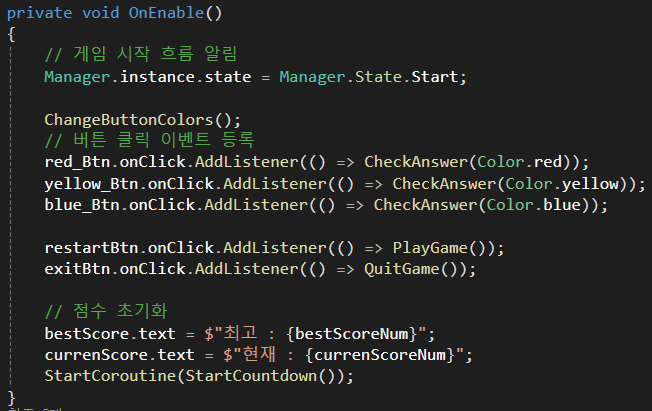 점수를 초기화해주는 로직과 StartCorutine으로 코루틴을 실행시킵니다.
