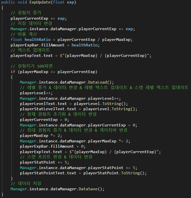 다음은 경험치가 오를 때 호출될 ExpUpdate 함수입니다.