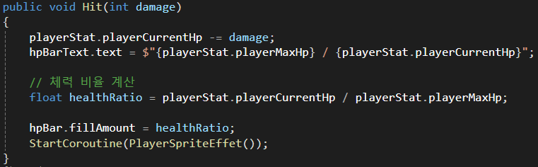 현재 체력과 최대 체력을 playerStat에서 받아와서 계산을 하였는데요.