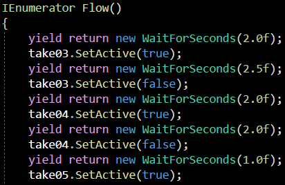 코드는 변수 선언과 코 루틴, 그리고 이 코 루틴 함수를 실행시켜줄 Start 함수 세 가지로 분류가 됩니다.