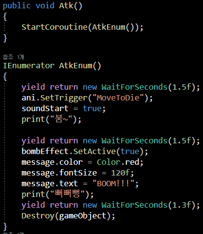Atk 함수에서는 코 루틴을 StartCorutinew으로 실행시켜 줬습니다.