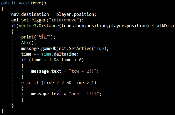 sqrMagnitude를 사용해도 되지 않을까..? 생각을 해봤는데, 자연스레 자주 사용하는 Distance 함수로 손이 갔습니다.if(Vector3.Distance(transform.position, player.position) < atkDis)