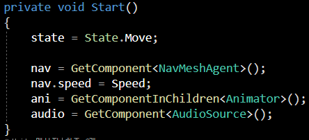 각 NavMeshAgent / Animator / AudioSource를 받아오는 모습입니다.