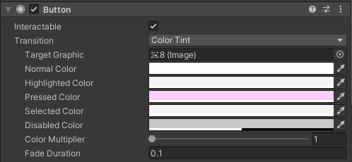 Pressed Color의 RGBA를 1, 0.8, 1, 1로 변경하여 눌렀을 시 색상의 변화를 주었습니다.