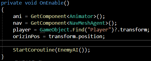 StartCoroutine(EnemyAI()) : StartCorutine 함수로 코 루틴 함수 EnemyAI를 실행해 줍니다.