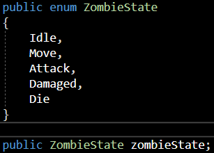 또한 이 ZombieState의 상태 값을 제어하기 위해서 변수를 선언해주었습니다. ZombieState = zombieState;