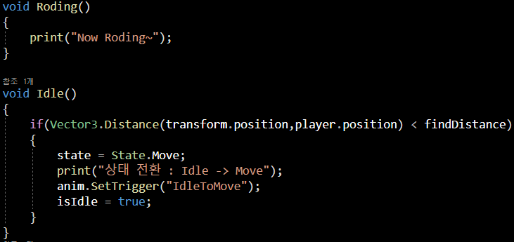 Distance함수를 이용해 transform(드래건)의 위치와 player의 위치를 계산하여, 지정한 findDistance 값 보다 작다면