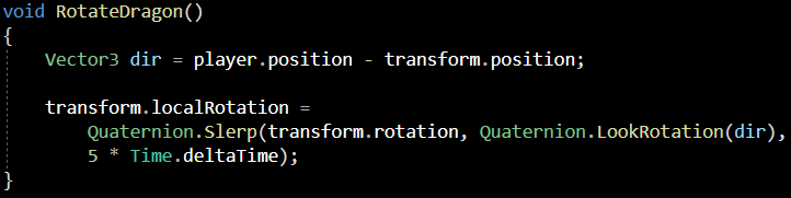 RotateDragon 함수는 Player를 향해 트랜스폼이 회전하는 동작이기에