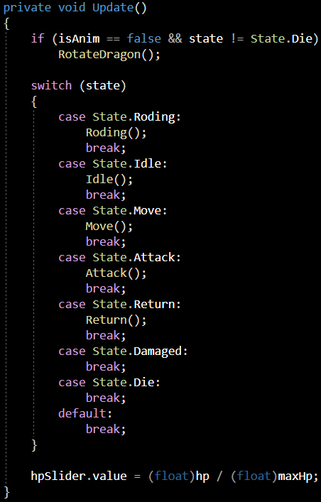 Update 함수 드래건의 상태 값은 Swicth문으로 각 상태 값에 맞는 함수 실행을 시켜줬습니다.