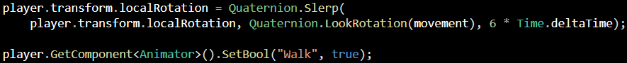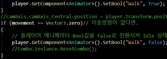player.GetComponent <Animator>(). SetBool("Walk", true) 코드와