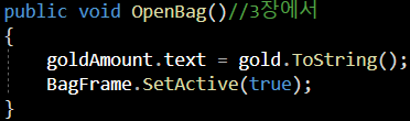 Manager.instance.managerInven.OpenBag() 코드의 OpenBag 함수를 보겠습니다.