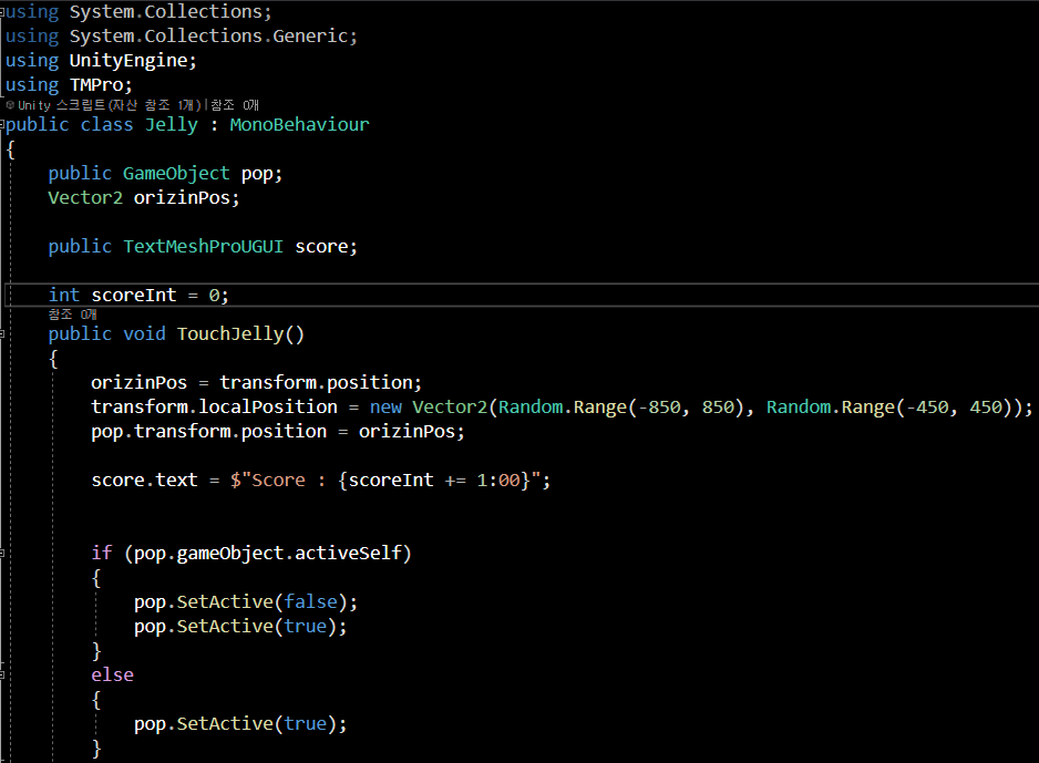 score : 젤리를 클릭/터치 시 오를 점수 textMeshProUGUI입니다.