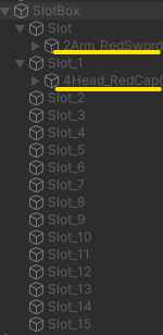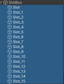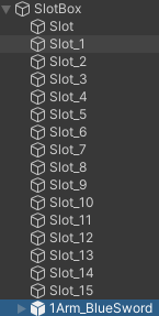 현재 hierarchy 창을 보시면, 각 1 Slot 안에 1개의 아이템이 존재합니다.