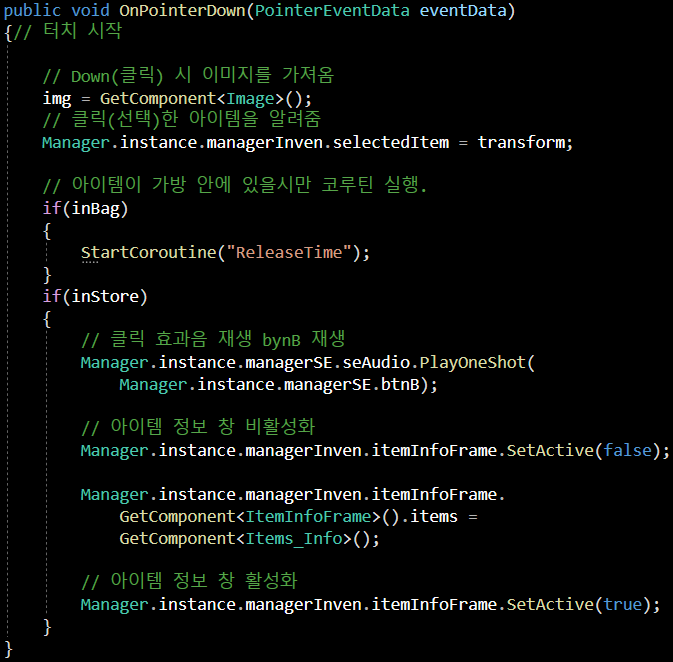 큼큼.. 다시 돌아와 OnPointerDown (터치 시 실행되는 이벤트)에서 실행될 첫 번째 조건문을 보겠습니다.
