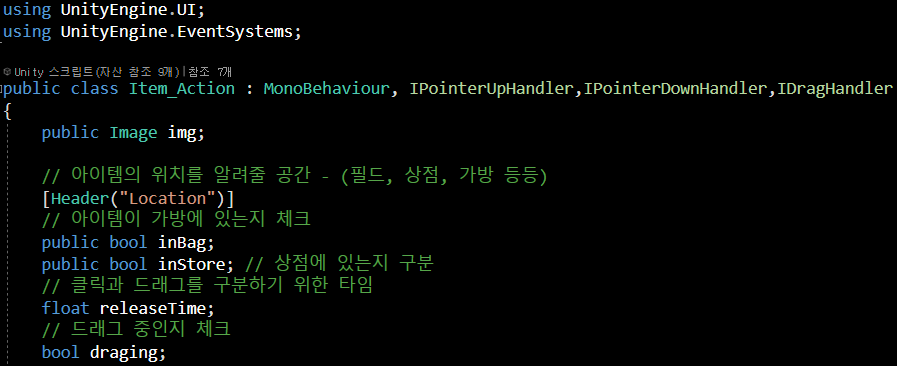 또한 EventSystem을 사용할 것이기에 using UnityEngine.EventSystems 네임스페이스를 선언해 주었습니다.