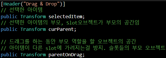 드래그가 해제되면 원래 부모인 curParent(Slot)으로 돌아가기 위함입니다.)