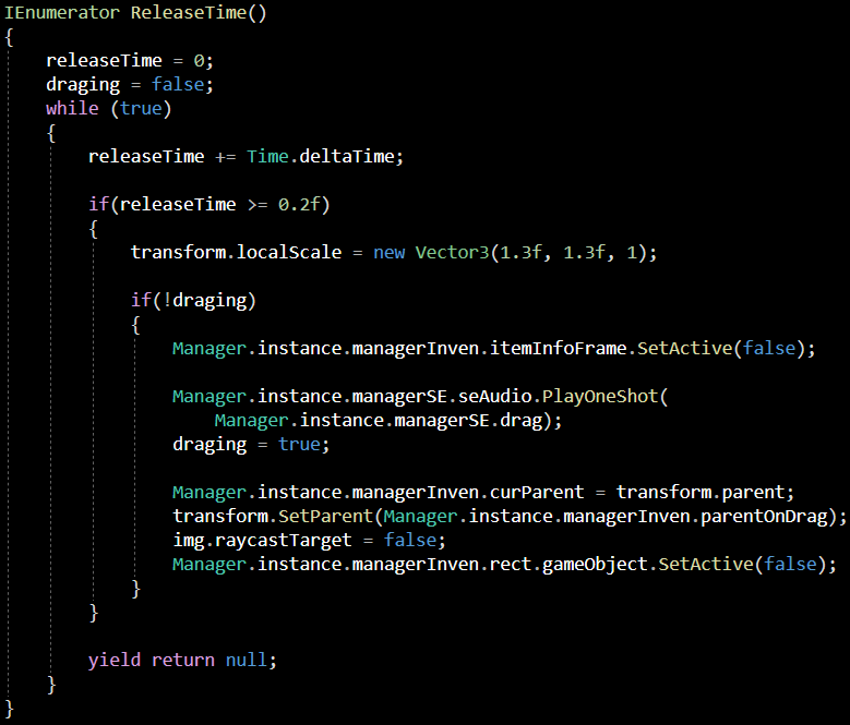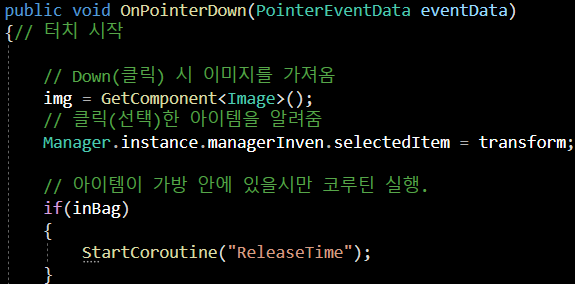 이 코 루틴 함수는, OnPointerDown(터치 시)에서 inBag(가방 안에 있는지)의 조건을 성립하면