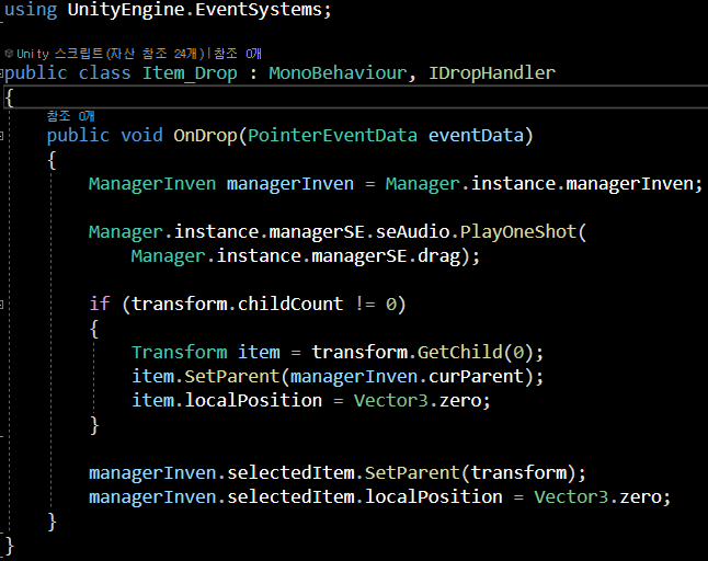 Item_Drp 에 있는 IdropHandler ManagerInven managerInven = Manager.instance.managerInven