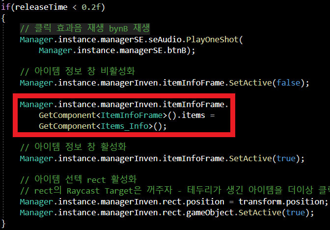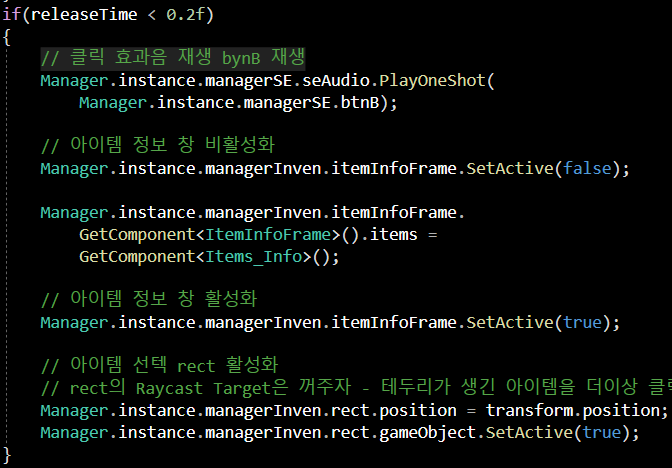 Manager.instance.managerInven.itemInfoFrame.SetActive(true)인포 창 동기화를 위해 SetActive로 비활성화/활성화해주는 코드입니다!!
