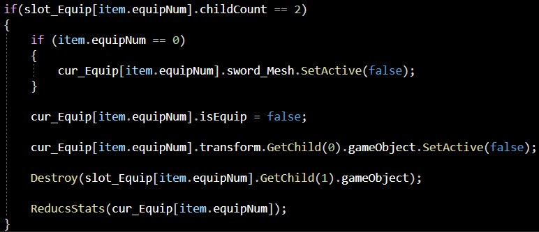 즉 이 장비 고유 번호에 해당하는 슬롯의 GetChild(1). gameObject를 파괴시켜주는 코드입니다.