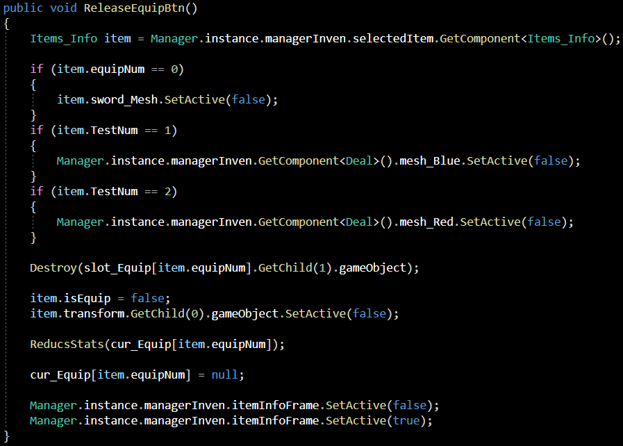 ReleaseEquipBtn 함수는 해제 버튼의 기능의 함수입니다.