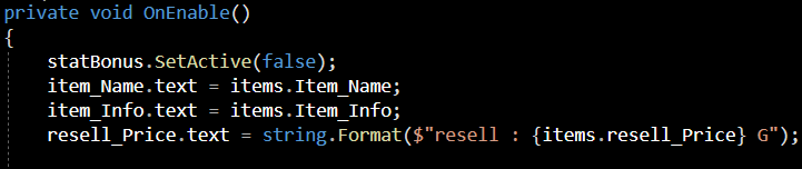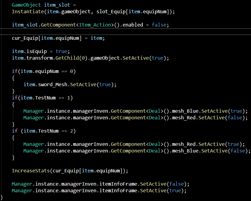이(item.gameObject)를 제어하기 위해 GameObject형으로 item_slot을 선언해 주었습니다.