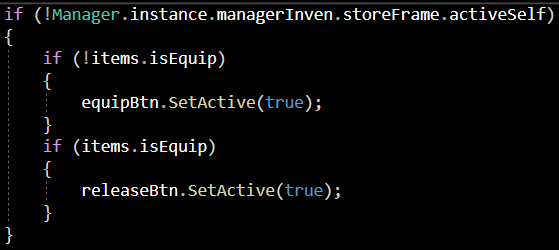 조건문을 보자면 if (! Manager.instance.managerInven.storeFrame.activeSelf)