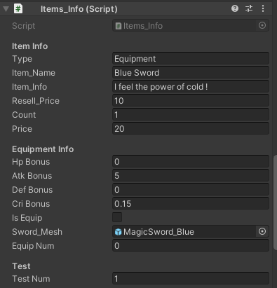 인스펙터 창에서 보는 아이템에 Items_Info 스크립트가 입혀진 모습입니다.